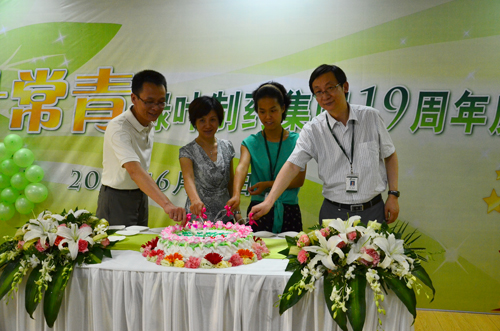 2013年6月18日,是綠葉制藥集團(tuán)19周年生日。盡管不能到煙臺(tái)參加集團(tuán)的周年慶典,但是綠葉思科的全體員工在南京一同為綠葉慶祝生日。在公司食堂搭起的既簡(jiǎn)單又美觀的慶祝會(huì)場(chǎng)里,程總為工作了十年以上的員工頒發(fā)了金葉子獎(jiǎng)?wù)?,還和獲獎(jiǎng)員工代表一起切了19周歲的生日蛋糕,大家一起分享了甜美的蛋糕和綠葉常青的味道。下午工會(huì)還組織了臺(tái)球比賽、摜蛋比賽和卡拉OK等一系列慶?;顒?dòng)。愿綠葉長(zhǎng)青,員工永遠(yuǎn)年輕、天天開(kāi)心!
