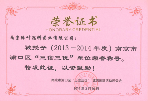 我公司于2014年3月被授予2013—2014年度南京市浦口區(qū)“三信三優(yōu)”單位榮譽(yù)稱號(hào)。充分驗(yàn)證了我公司是“價(jià)格誠(chéng)信、質(zhì)量誠(chéng)信、計(jì)量誠(chéng)信,優(yōu)質(zhì)服務(wù)、優(yōu)美環(huán)境、優(yōu)良管理”的企業(yè)。