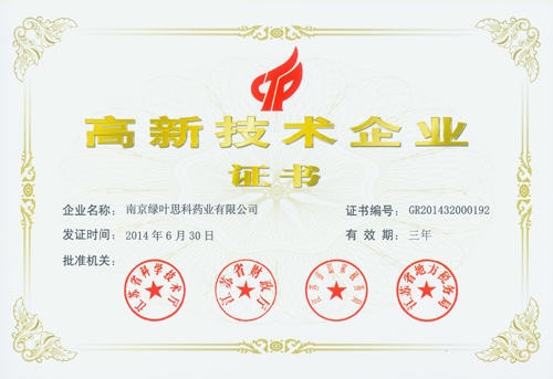 綠葉思科藥業(yè)順利通過2014年江蘇省第一批高新技術(shù)企業(yè)認定,再次榮獲“高新技術(shù)企業(yè)”稱號,有效期為三年。被認定為高新技術(shù)企業(yè),不僅是對公司研究開發(fā)組織管理水平、科技成果轉(zhuǎn)化能力、自主知識產(chǎn)權(quán)等科研綜合實力方面的再次認可,也是對公司多年來堅持自主研發(fā)、技術(shù)創(chuàng)新、堅持走高新技術(shù)發(fā)展道路的有力肯定。 高新技術(shù)企業(yè)作為一項國家級的資質(zhì)認證,將有效地提高企業(yè)的科技研發(fā)管理水平,增強企業(yè)核心競爭力,對提升企業(yè)形象和社會知名度、提高市場競爭力發(fā)揮積極作用。對于依靠科技立身的企業(yè)在申報科技項目,實現(xiàn)成果應(yīng)用,助推企業(yè)發(fā)展方面都具有十分重要的現(xiàn)實意義。