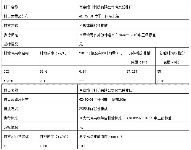 南京綠葉制藥有限公司廠區(qū)污水站和廢氣處理裝置于2010年3月與公司新建GMP廠房項(xiàng)目同時(shí)設(shè)計(jì)、同時(shí)施工,同時(shí)投入使用,2013年1月通過(guò)環(huán)??⒐を?yàn)收。2015年2月通過(guò)清潔生產(chǎn)審核, 2016年5月一次性通過(guò)ISO9001:2008、ISO14001:2004和OHSAS18001:2007管理體系的認(rèn)證。廠區(qū)內(nèi)雨污分流,污水經(jīng)污水管網(wǎng)匯聚至廠區(qū)污水站,經(jīng)微電解+水解酸化+接觸氧化法工藝處理達(dá)國(guó)家污水綜合排放標(biāo)準(zhǔn)三級(jí)后排入橋北污水處理廠,日處理污水量約200t。廢氣處理裝置主要采用水噴淋+活性炭吸附,達(dá)到大氣污染綜合排放標(biāo)準(zhǔn)二級(jí)后15米高空排放。