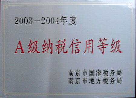 近日,我公司獲南京市國(guó)家稅務(wù)局、南京地方稅務(wù)局頒發(fā)的“2003-2004”年度“A級(jí)納稅信用等級(jí)”稱號(hào),這是我國(guó)稅務(wù)系統(tǒng)向企業(yè)頒發(fā)的最高級(jí)別信用等級(jí)稱號(hào)。在南京市十幾萬(wàn)家企業(yè)中,僅有269家企業(yè)獲得此殊榮。