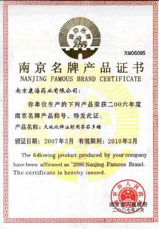 我公司生產(chǎn)的“天地欣”(注射用香菇多糖)被南京市人民政府命名為南京市名牌產(chǎn)品。